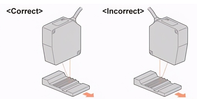 當移動物體的表面不平坦時,如下圖所示安裝傳感器,以減少測量物體時臺階邊緣的影響。