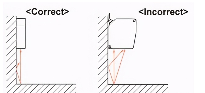 如下所示安裝傳感器,以防止多束反射光線進入墻壁上的接收部分。另外,在壁的反射率高的情況下,使用非光澤的黑色壁是有效的。