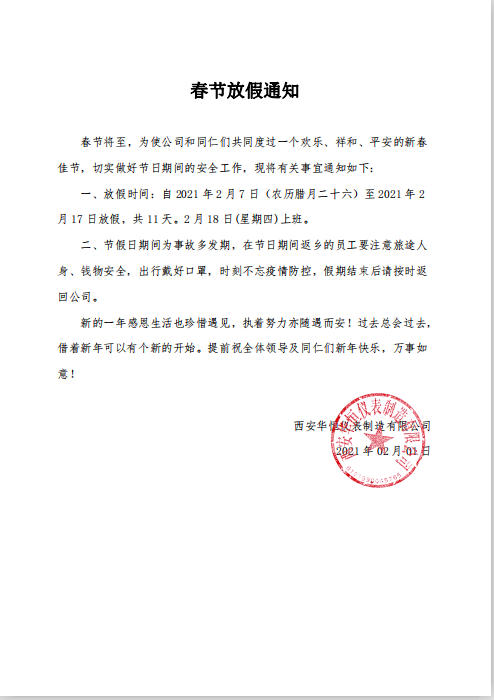 一、 放假時間:自2021年2月7日(農歷臘月二十六)至2021年2月17日放假,共11天。2月18日(星期四)上班。