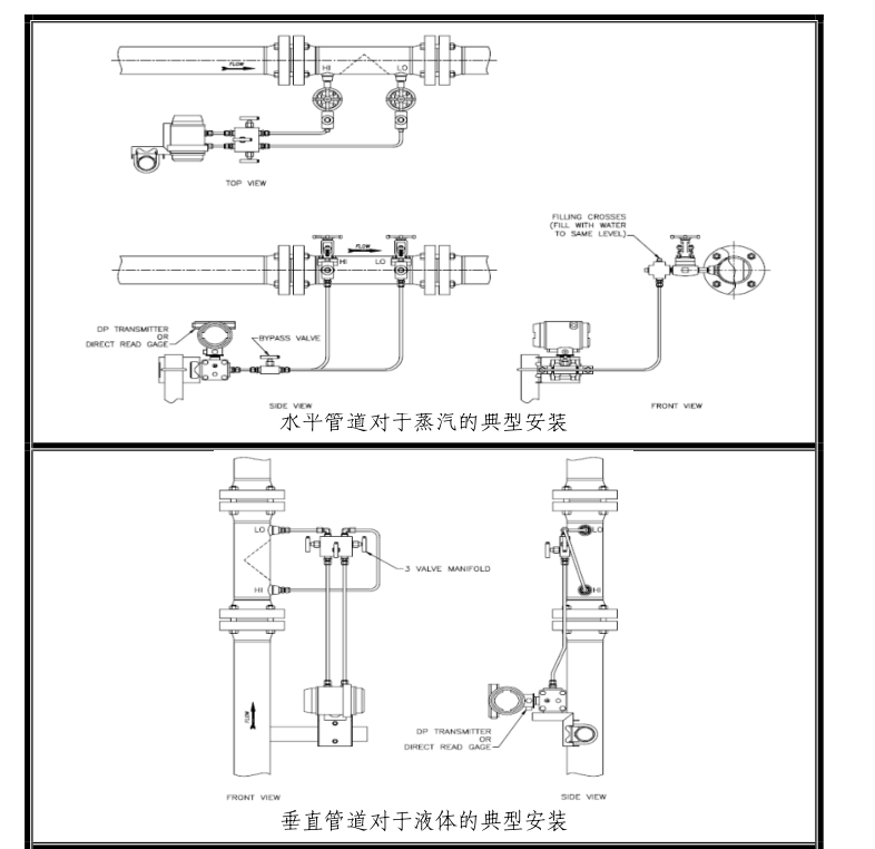 對于楔式流量計的垂直安裝方式,在變送器的調零過程中一定要考慮可能會產生的靜壓頭效果。楔式流量計與變送器之間的引壓管最小應為3/8''管。(如FIG.2)變送器的調零過程中建議應用三閥組。