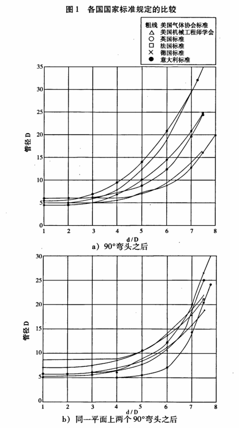 產生分岐的一個原因可能是由于結構上差異引起的,例如IS05167:2003(E)把在垂直平面上兩個或兩個以上90。彎頭按兩個彎頭之間間距不同分為二種:S5D和30DS5D,而IS05167:1980卻只歸為一種(相當于S5D),因而其規定的長度對較大間距的就顯得過長了。又如同樣稱為彎頭,其結構形狀及尺寸可能有較大差異(彎頭的幾何參數有:轉角6,相對曲率半徑r/D,橫截面相對扁度%/60,進口面積和出口面積比值E/瓦等),這些參數的差異亦會影響試驗的結果。