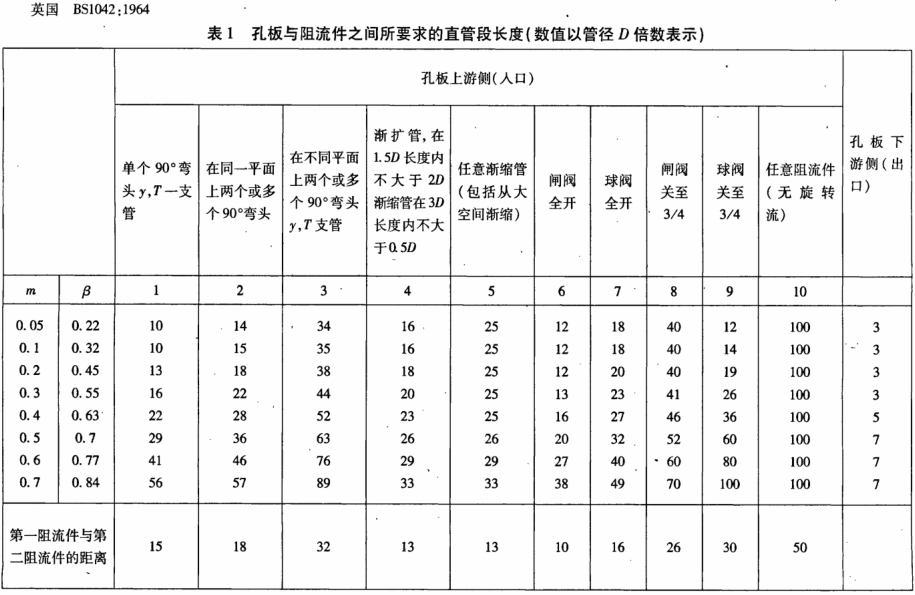 英國BSl042:1964孔板流量計直管段長度規定如表1所示孔板流量計直管段長度規定歷經80余年終于由IS05167:2003(E)獲得統一,其特點可列舉若干如下。