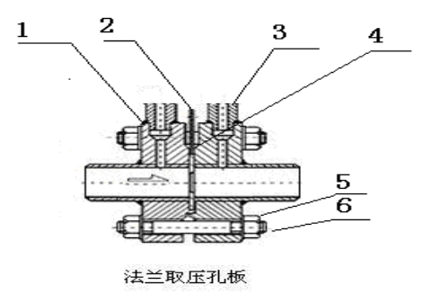 圖3、標準法蘭孔板節(jié)流裝臵示意圖(Pg64)1、取壓法蘭2、孔板3、導壓管4、密封墊5、螺母6、螺栓