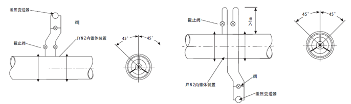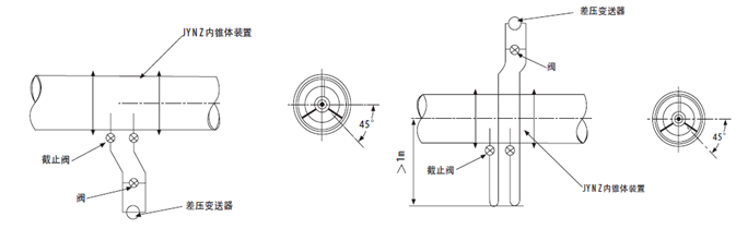 ?。?)如果變送器不得不安裝在內錐體裝置的上方,為了減少液體中的氣體進入導壓管內,應在內錐體裝置和導壓管之間裝U型彎管,且彎頭下端至少低于管道中心1米。