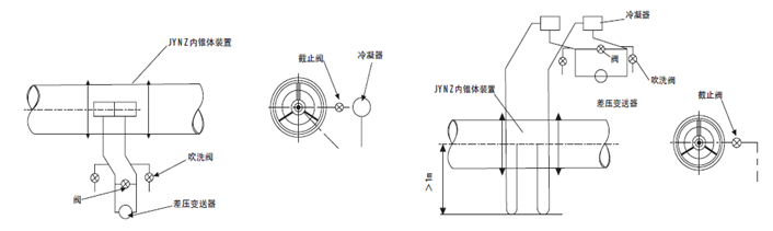 ?。?)如果差壓變送器不得不安裝在內錐體裝置的上方,應把冷凝器裝在高于差壓變送器的地方。
