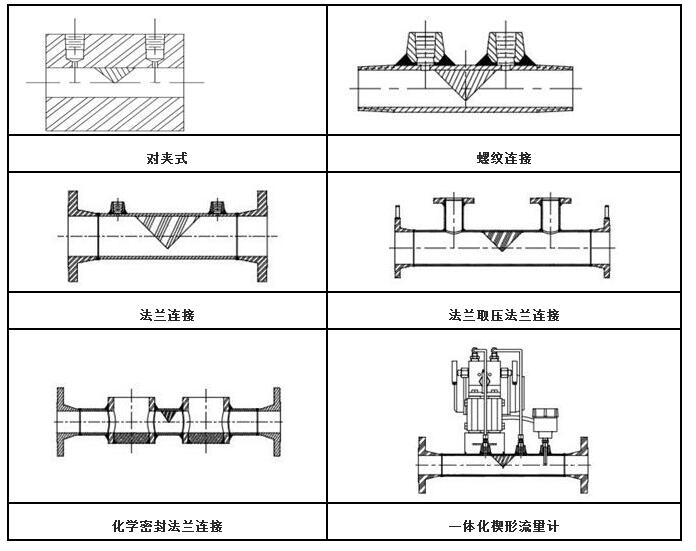 楔形流量計按其組裝方式分為一體型和分離型,按其連接方式分為法蘭連接、焊接連接、螺紋連接及對夾式連接,按其取壓方式分為普通取壓、法蘭密封取壓等結(jié)構(gòu)。詳見下表: