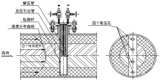 阿牛巴流量計由檢測桿、取壓口和導桿組成。阿牛巴的檢測管截面形狀分為圓形、菱形、橢圓形等多種結(jié)構(gòu)。如圖所示。