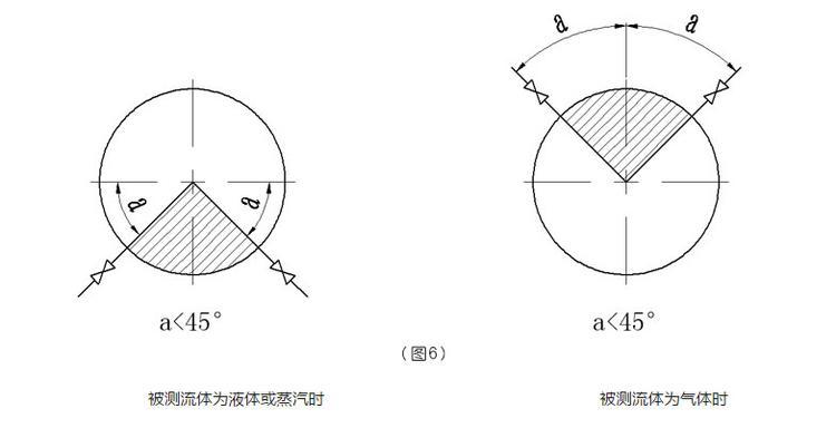 ①如圖4和5所示:測量液體和水蒸汽介質流量時,取壓管口最佳安裝角度為0和180;如果在0和180不可能安裝時,可在0~60和120~180范圍內選擇。但差壓變送器必須垂直安裝在三閥組的垂直端面上。