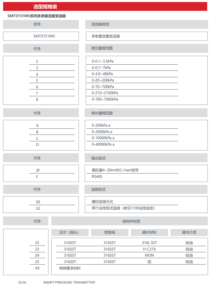 SMT3151MV系列多參量變送器差壓量程范圍為 50Pa~10MPa(0.5mbar~100bar),最大工作壓力分別為 0.6MPa、2MPa、10MPa 或 40MPa。針對高溫、高腐蝕、粘稠介質可以提供各種規格的法蘭連接型式,以適應不同復雜的工業現場需要。